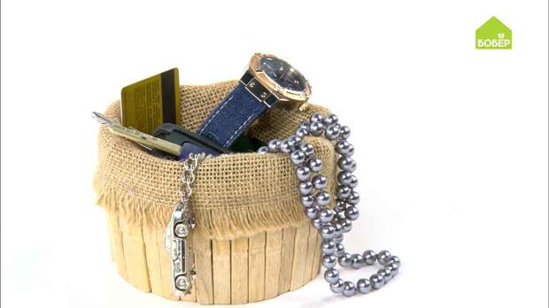Делаем своими руками стильную интерьерную корзину из прищепок. Пластиковая ёмкость + нож + деревянные прищепки + клеевой пистолет + ткань + мешковина + ножницы = Корзина из прищепок для хранения мелочей.